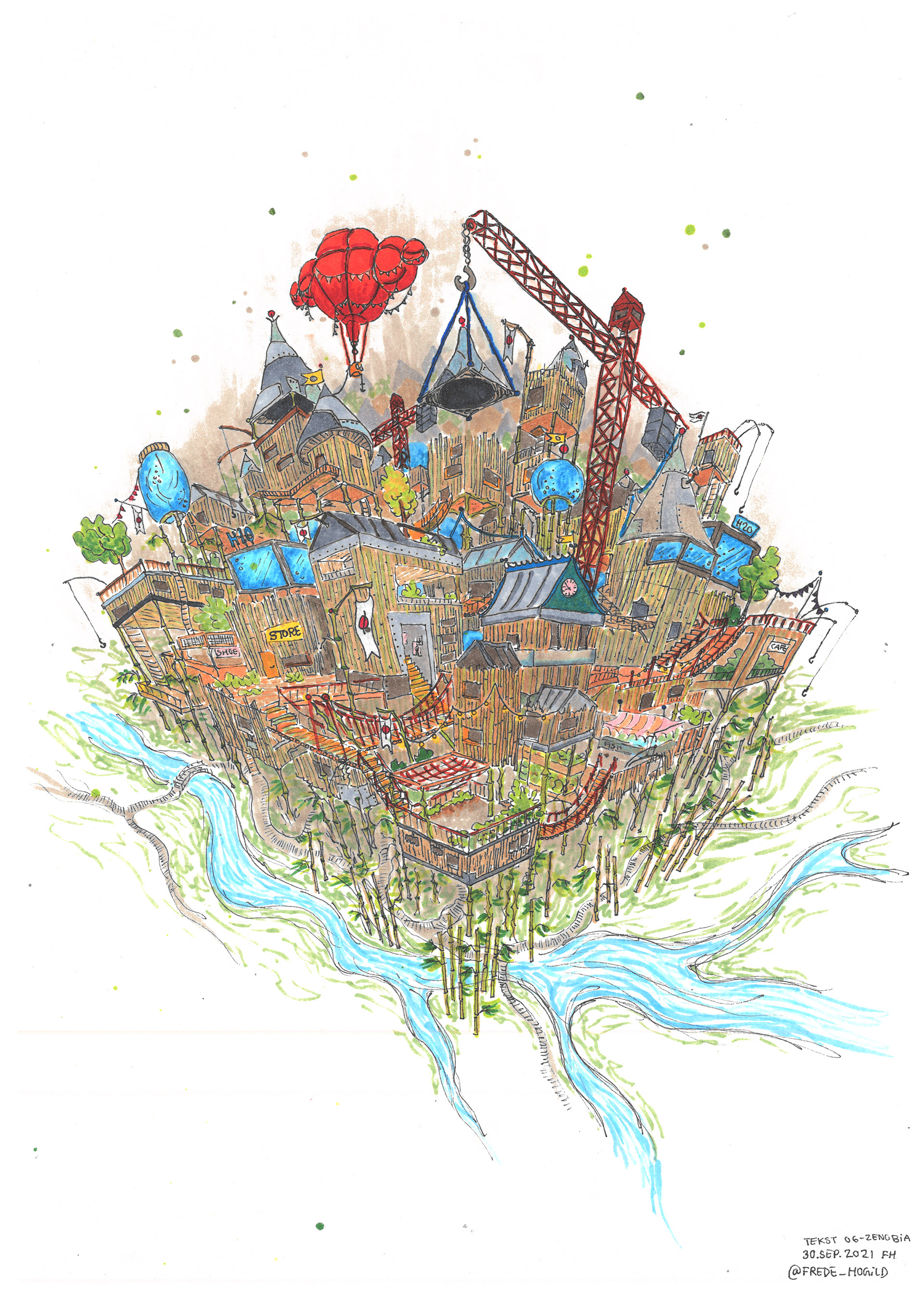 An illustration based on a text about a city called "Zenobia". This can be seen both with and without colour.